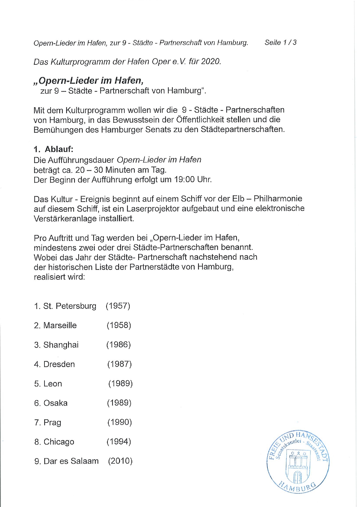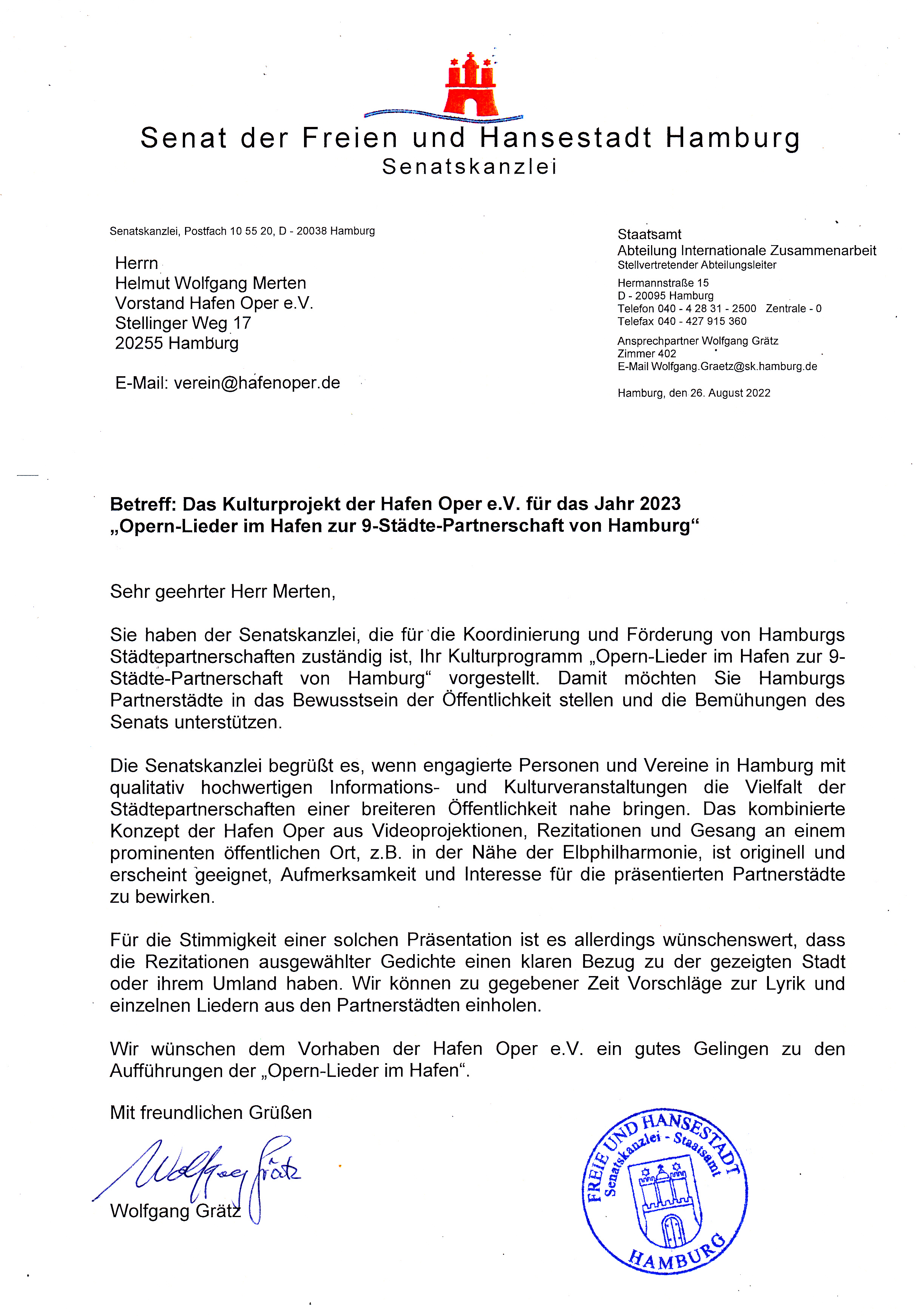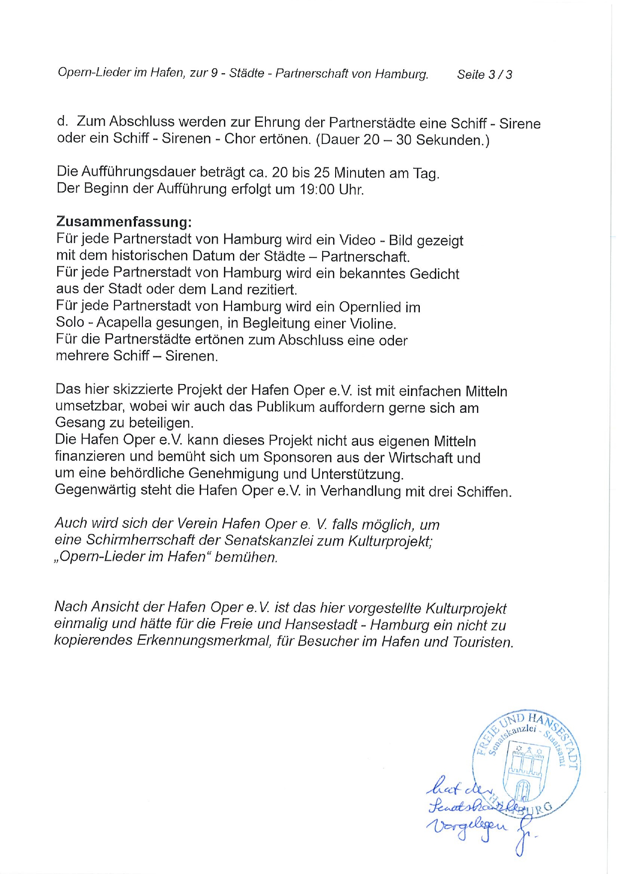 Der abgebildete Brief der Senatskanzlei Hamburg, ist eine Unterstützung zum Kulturprojekt: